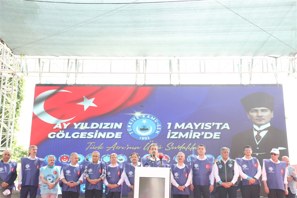 Saygı duruşu ve hep bir ağızdan coşkuyla okunan İstiklal Marşı’mızın ardından kürsüye gelen Genel Başkanımız Önder Kahveci, İzmir’den tüm Türkiye’ye selam göndererek, 1 Mayıs Emek ve Dayanışma Gününü kutladı.