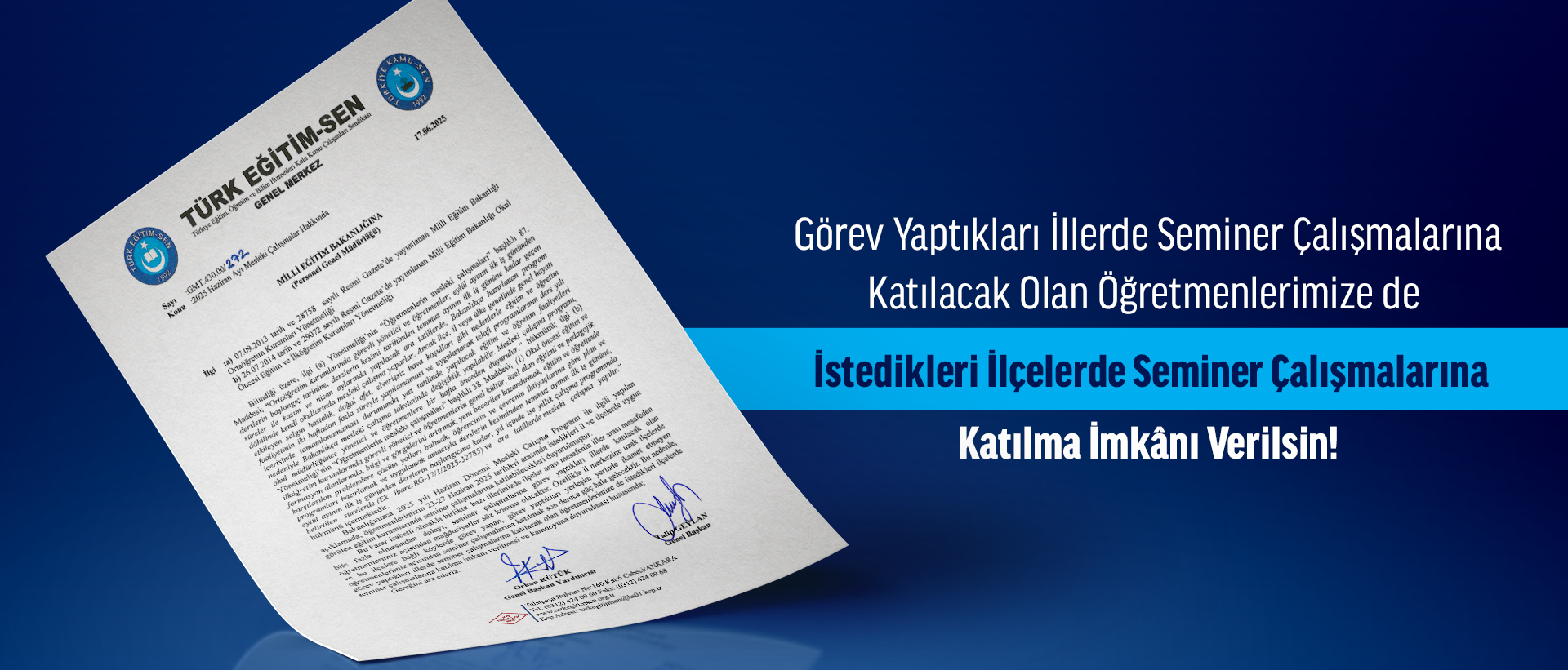 Bu karar isabetli olmakla birlikte, ancak bazı illerimizde ilçeler arası mesafenin iller arası mesafeden bile fazla olmasından dolayı, seminer çalışmalarına görev yaptıkları illerde katılacak olan öğretmenlerimiz açısından mağduriyetler söz konusu olacaktır. Özellikle il merkezine uzak ilçelerde ve bu ilçelere bağlı köylerde görev yapan, görev yaptıkları yerleşim yerinde ikamet etmeyen öğretmenlerimiz açısından seminer çalışmalarına katılmak son derece güç hale gelecektir. Bu nedenle, görev yaptıkları illerde seminer çalışmalarına katılacak olan öğretmenlerimize de istedikleri ilçelerde seminer çalışmalarına katılma imkânı verilmesi ve kamuoyuna duyurulması hususunda Milli Eğitim Bakanlığı’na yazılı başvuruda bulunduk.