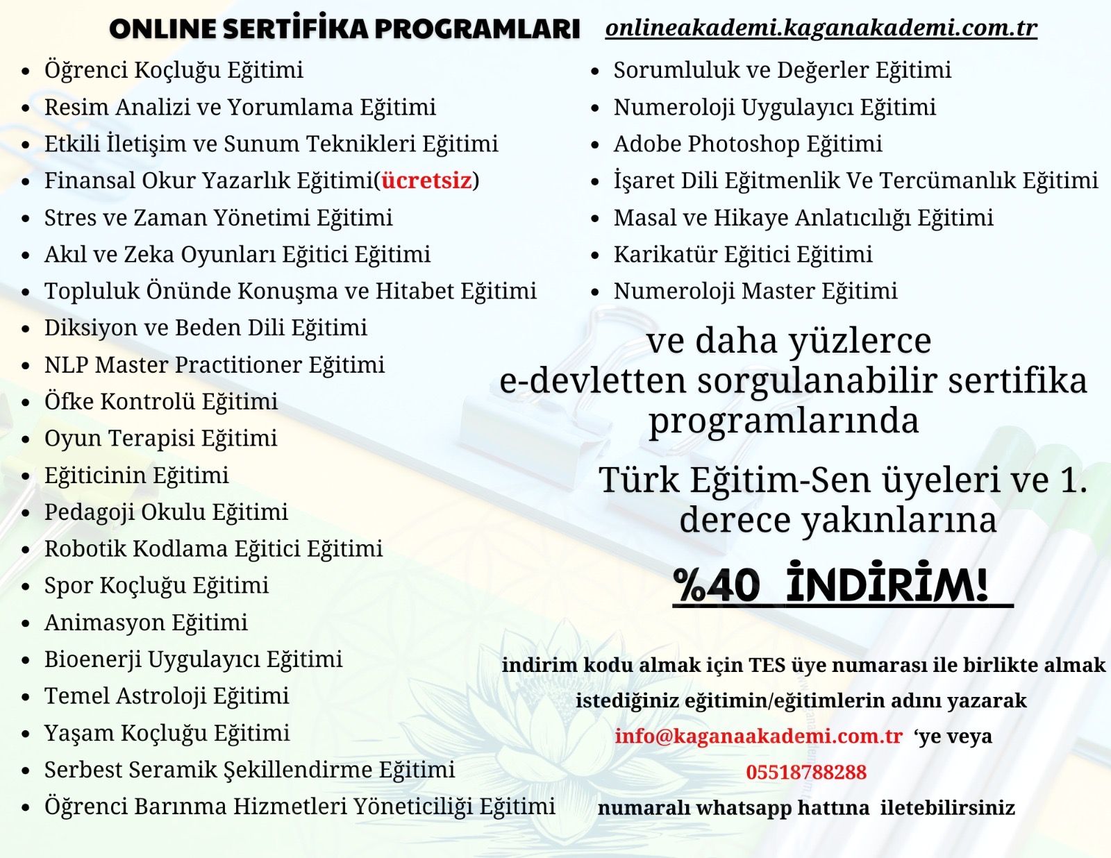 Üyelerimiz Türk Eğitim Sen kimlik numaraları ile info@kaganakademi.com.tr adresine veya 0551 878 82 88 numaralı whatsApp hattına almak istedikleri eğitimlerin adını ilettiklerinde, indirim kodları kişiye özel tanımlanacaktır.